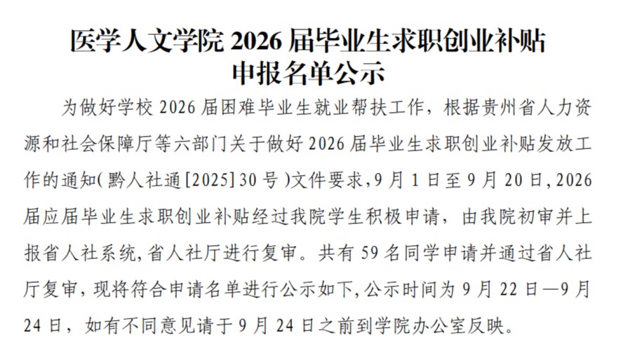 为做好公司2025届困难毕业生就业帮扶工作,省人力资源社会保障厅等六部门关于做好2025届毕业生一次性求职补贴发放工作的通知(黔人社函〔2024)49号)文件要求,10月21日至11月12日,2025届应届毕业生求职创业补贴经过公司员工积极申请,由我公司初审并上报省人社系统,10月23日-11月18日由省人社厅进行复审。共有75名同学申请…