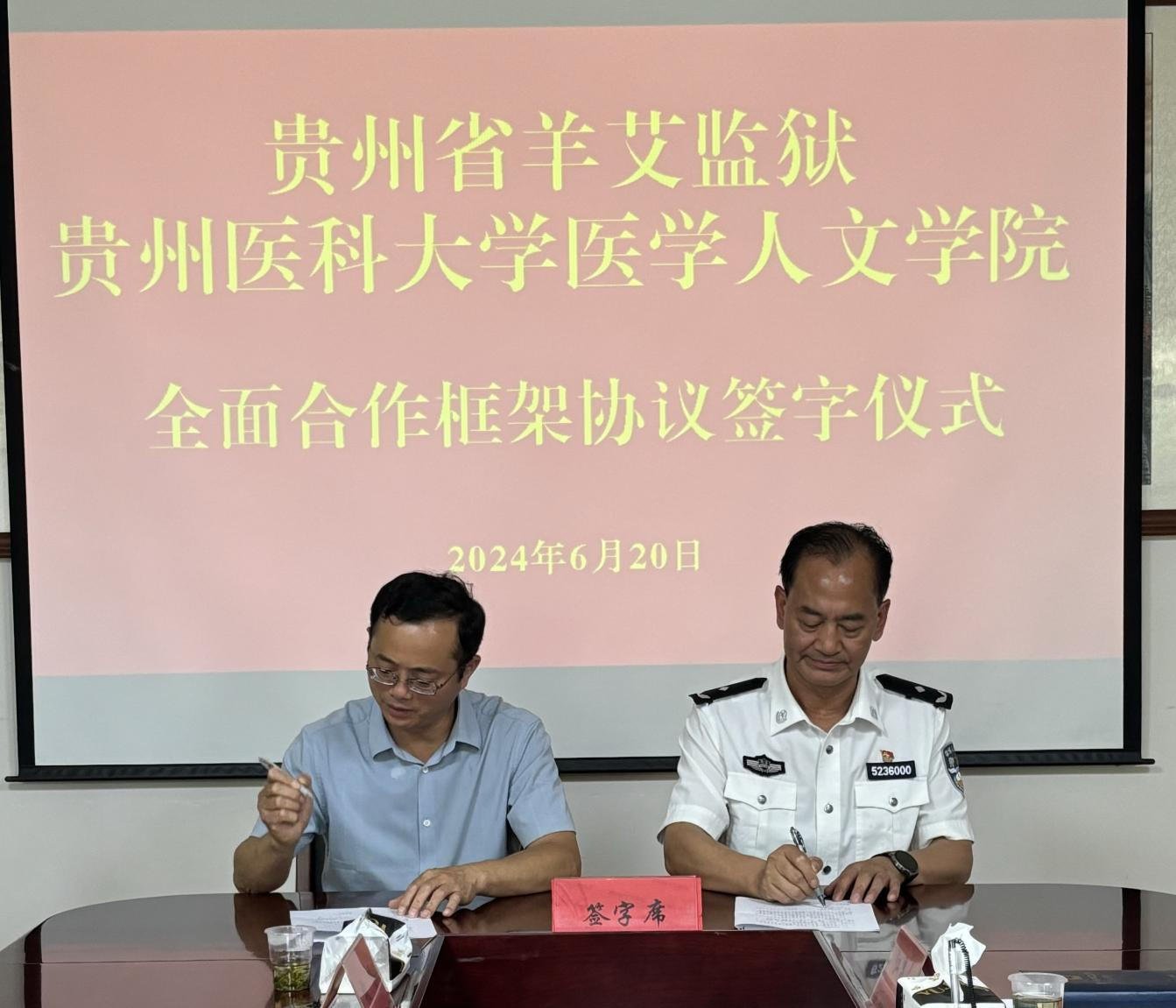 在揭牌仪式之前,贵州省羊艾监狱与公司全面合作框架协议签字仪式在羊艾监狱行政楼会议室举行。羊艾监狱党委书记、监狱长李启禄与公司党委书记江宣成签署合作协议;羊艾监狱副监狱长姚烨、田勇、谢兴强、江显平及相关部门负责人,公司经理冯广卫、正处级组织员刘雪梅、党委副书记兼纪委书记张贤及相关人员参加签字仪式。