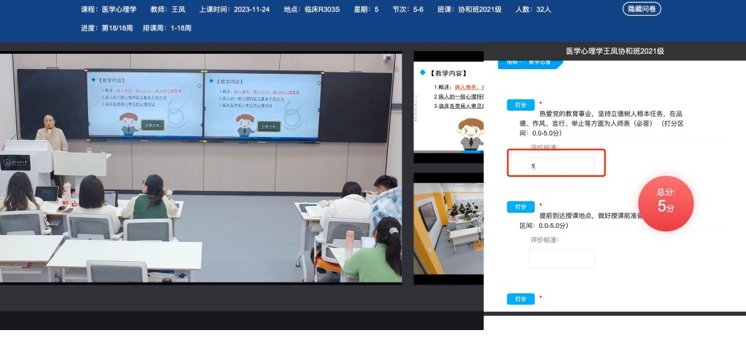 2024年12月30日至2025年1月3日,30位督导专家分成10组,分别在相应的听评课室开展工作,共评课451门(覆盖全学期理论课程),每组专家完成听评课程50余节次,并根据《williamhill官网课堂教学质量评价表》《williamhill官网思政课教学质量评价表》在督导系统认真完成打分,同时给出具体评价与指导意见。